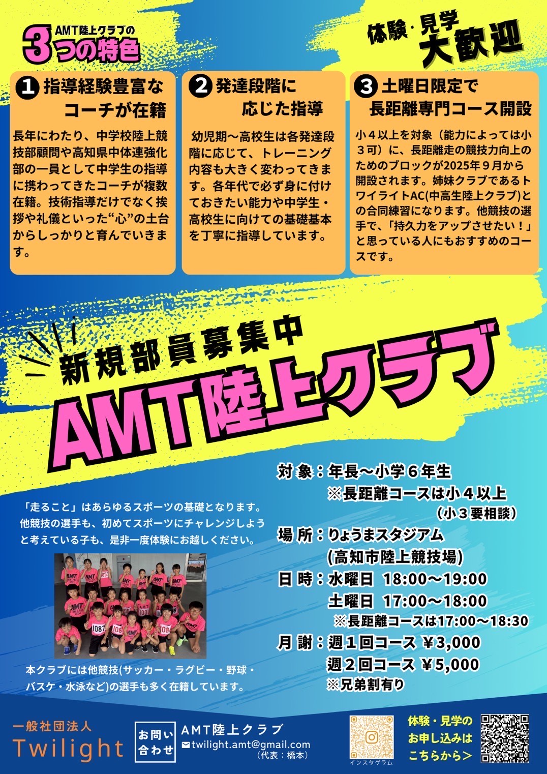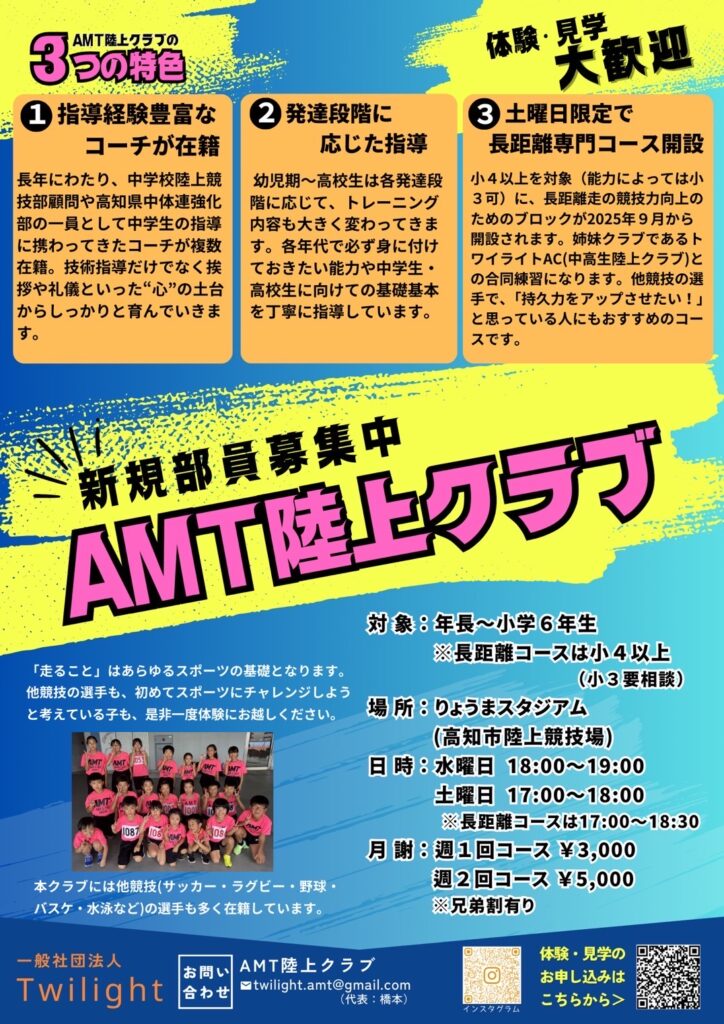 いつもお世話になっております。当クラブは9月より、指導体制の充実を図りAMT陸上クラブさんと一緒に活動することとなりました。小学生のクラブにつきましてはAMT陸上クラブで活動しておりますので体験を希望される方はAMT陸上クラブさんにご連絡をお願い致します。